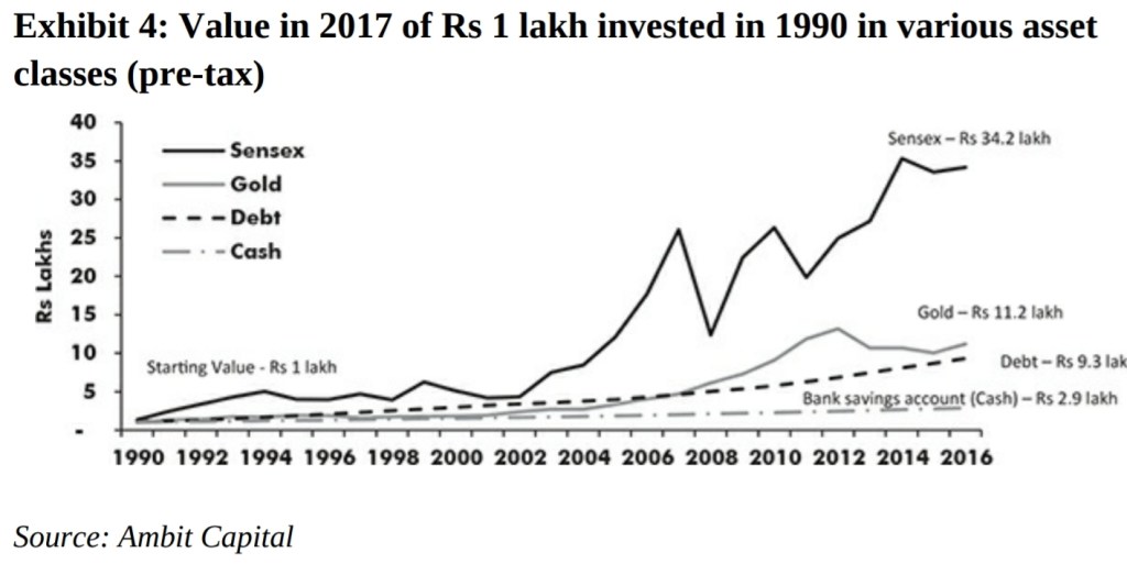 It was between 1990 and 1995 that retail investors in India fell in love with stock market investing for the first time. In this period BSE Sensex was quadrupling in less than twenty months—from 1000 points in July 1990 it crossed 4000 points1 in March 1992, supported by the liberalization of economic policies. Investors’ love for the stock market was such that the number of retail investment folios that existed in 1995 was more than the number today. The effect of this investor interest was also reflected in IPOs—during 1992– 96, around 4000 companies went public (implying around four IPOs per day). All the investors were investing their black money because lack of regularity. In that period company used to give 6-8 pages of IPO prospectus to investor versus 500 pages of today. Many promoter defaulted many companies came out be a dump company but after the SEBI came into picture and changed the format of holding stocks in Dematerialized form. After that phase people started investing in Real estate and gold in the year 2013. There was a boom market for real estate prices in Mumbai were same as New York city. However, there has been a trend reversal in investors’ choice of asset classes since 2015, the year in which the NDA launched its multi-pronged attack on black money.